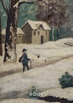Old oil painting on canvas depicting a snowy animated landscape with mountains and a lake, signed G. Canvas size 55 X 46 cm. In its original condition, see photos for more details.