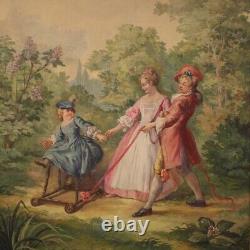 Romantic oil painting in an antique style from the 20th century. Large Italian painting from the first half of the 20th century. Oil painting on canvas with a romantic theme of a walk in the park of good pictorial quality. The painting depicts a very pleasant scene, a young couple of parents with a child transported to play on a cart. Exceptionally large painting, with fabulous furnishings, with a non-contemporary carved and lacquered wooden frame.