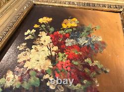 Old oil painting on wood, flower bouquet in a wooden and plaster frame. Frame dimensions: 40cm x 33cm. Painting dimensions: 21cm x 15cm.