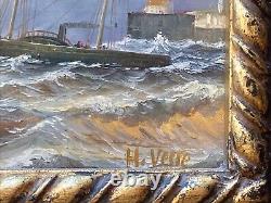 Miroir trumeau ancien dans un cadre doré, tableau signé en bas à droite H. Verre, peinture à l'huile sur panneau représentant des bateaux à voiles et à vapeur.