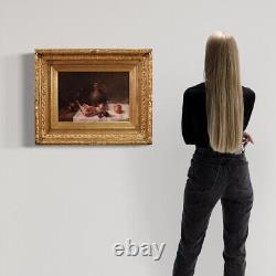 Nature morte signée tableau ancien huile sur toile peinture 19ème siècle. Nature morte hollandaise de la seconde moitié du 19ème siècle. Oeuvre huile sur toile représentant une table chargée de libations, d'une grande qualité picturale. Au centre du tableau, on voit un morceau de viande et de délicieux oignons, à l'arrière-plan, on trouve un pot et une cruche en céramique magnifiquement peints. La nappe blanche contraste fortement avec le fond sombre du mur, donnant de la lumière et de la profondeur à la composition.
