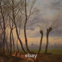 Peinture tableau ancien huile sur toile 19ème siècle cadre paysage personnages. Français ancien de la seconde moitié du. Peinture à l'huile sur toile représentant un paysage de campagne avec agriculteurs et voyageurs. Cadre en bois et plâtre non contemporain, du 20ème siècle, sculpté et argenté. Cadre avec quelques signes de vieillissement et de petites.